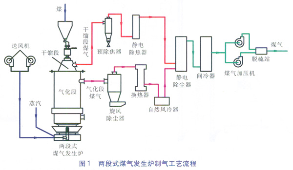 由于干餾段為煤的低溫干餾,因此干餾段煤氣含有未裂解的輕質(zhì)焦油,需要采用除焦器去除干餾段煤氣中的焦油。氣化段煤氣往往含有炭黑、灰塵、水分,需要采用旋風除塵器等設備進行除塵[5],并利用換熱設備脫除氣化段煤氣中的水分。經(jīng)處理后的干餾段煤氣、氣化段煤氣混合后經(jīng)煤氣加壓機及脫硫后供給用戶。