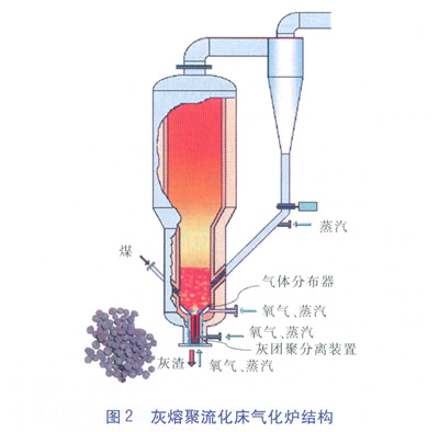 灰熔聚流化床氣化爐采用傳質(zhì)、傳熱效率較高的流化床處理粉煤,粉煤與氣化劑在底部濃相區(qū)進入氣化爐即開始發(fā)生反應,煤在氣化爐內(nèi)一次實現(xiàn)破粘、脫揮發(fā)分、氣化、灰團聚及分離、焦油及酚類的裂解等過程,煤熱解與氣化產(chǎn)生的煤氣均通過了高溫區(qū)域發(fā)生裂解,幾乎不產(chǎn)生焦油、酚類物質(zhì)及有機硫化物。
