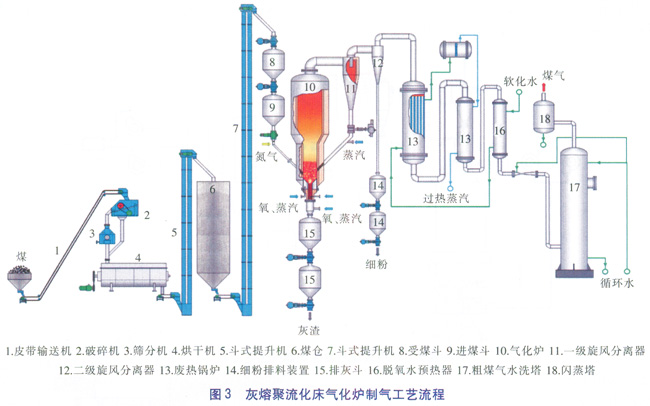 灰熔聚流化床氣化爐制氣工藝流程見圖3。入爐粉煤送入氣化爐內(nèi)與氣化劑發(fā)生氣化反應產(chǎn)生高溫煤氣。高溫煤氣帶出的細粉大部分經(jīng)一級旋風分離器捕集,返回氣化爐進一步氣化,二級旋風分離器捕集少量細粉并排出系統(tǒng)。除塵后的熱煤氣依次進入廢熱鍋爐、脫氧水預熱器回收熱量,再經(jīng)粗煤氣水洗塔、閃蒸塔處理后送至用戶。