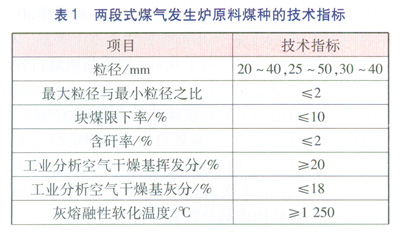 兩段式煤氣發(fā)生爐適宜氣化的煤種為不粘煤、弱粘煤、長焰煤等煙煤。雖然相對單段式煤氣發(fā)生爐而言,兩段式煤氣發(fā)生爐適用煤種范圍較寬,但是對原料煤的指標仍然要求比較嚴格。兩段式煤氣發(fā)生爐原料煤種的技術指標見表1。塊煤限下率:塊煤中小于規(guī)定粒徑下限部分的質(zhì)量分數(shù)。熱穩(wěn)定性指標TS+6:量取一定量粒徑為6~13mm的煤樣,在(850±15)℃的馬弗爐內(nèi)隔絕空氣條件下加熱30min后稱量、篩分,粒徑大于6mm的殘焦質(zhì)量占各級粒徑殘焦質(zhì)量之和的百分比??顾閺姸缺碚饕欢降拿簶幼杂陕湎潞罂蛊扑榈哪芰Γ簩⒘綖?0~100mm的塊煤從2m高處自由落到規(guī)定厚度的鋼板上,然后將落下的煤中粒徑大于25mm的塊煤再次落下,共落下3次,以破碎后粒徑大于25mm的塊煤占原煤樣的質(zhì)量分數(shù)表示煤的抗碎強度。