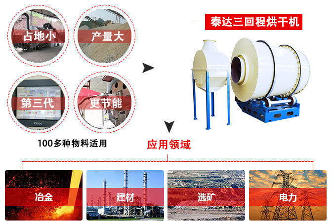 泰達(dá)三回程烘干機(jī)械化程度高,生產(chǎn)能力較大,可連續(xù)運(yùn)轉(zhuǎn)。結(jié)構(gòu)優(yōu)良﹑簡(jiǎn)單﹑物料通過筒體阻力運(yùn)行平穩(wěn)﹑操作方便。