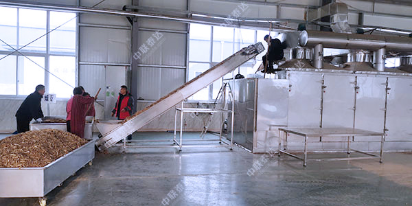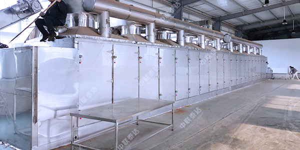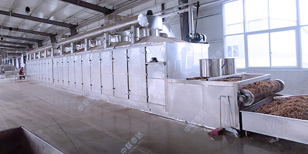 網(wǎng)帶烘干機(jī)將所要處理的物料通過布料機(jī)構(gòu)分布在上層網(wǎng)帶上,輸送網(wǎng)帶一般采用12-60目的鋼絲網(wǎng)帶,輸送帶通過一個(gè)或幾個(gè)加熱單元組成的通道,由傳動(dòng)裝置拖動(dòng)在干燥機(jī)內(nèi)往返移動(dòng),每個(gè)加熱單元均配有空氣加熱和循環(huán)系統(tǒng),每一個(gè)通道有一個(gè)或幾個(gè)排濕系統(tǒng),在輸送帶通過時(shí),熱風(fēng)在物料間穿流而過,水蒸氣從排濕孔中排出,從而達(dá)到均勻干燥的目的。箱體長(zhǎng)度由標(biāo)準(zhǔn)段組合而成,為了節(jié)約場(chǎng)地,可將烘干機(jī)制成多層式,常見的有二室三層、二室五層、長(zhǎng)度6-40m,有效寬度0.6-3.0m。烘干前原料可以通過預(yù)烘干輸送機(jī)預(yù)烘干,烘干后的產(chǎn)品可以直接排出,也可以經(jīng)過冷卻輸送帶吹冷風(fēng)冷卻。